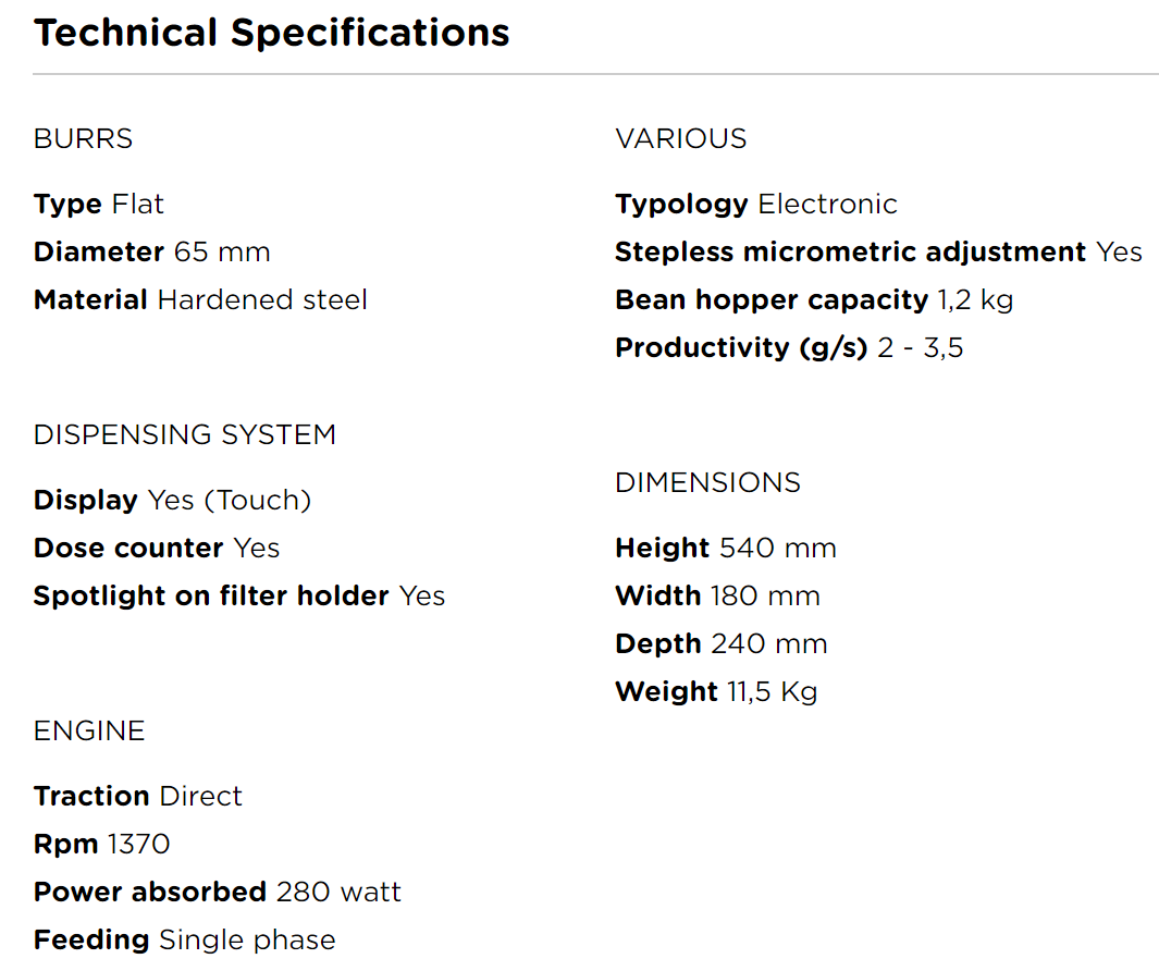 - New Super responsive touch TFT display that allows to easily set the weight for three programmable doses. GBW in continuous mode as well !Allows switching from one dose to the other during the grinding process.