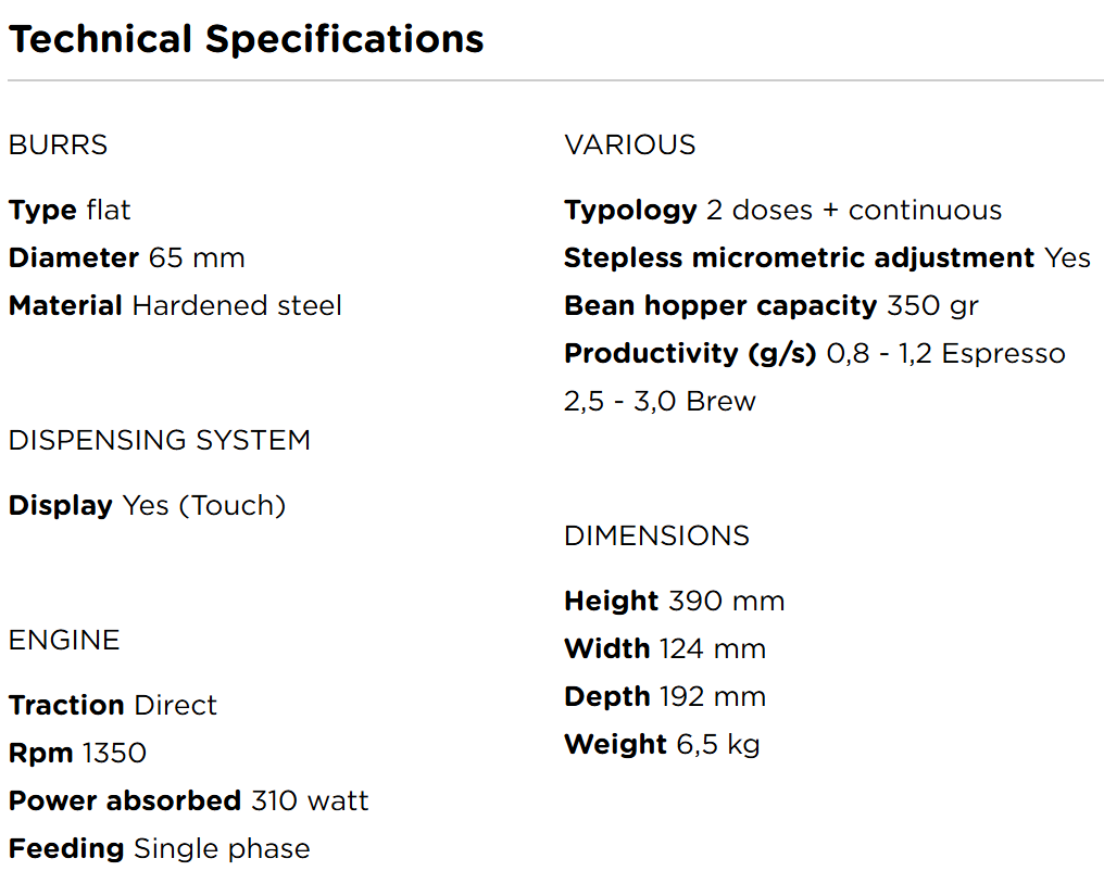 - Innovative 65 mm flat burr set (with upper blind burrs) is designed to provide excellent results with all brewing, to reduce coffee retention and increase the grind output consistency thanks to a wider grinding surface.